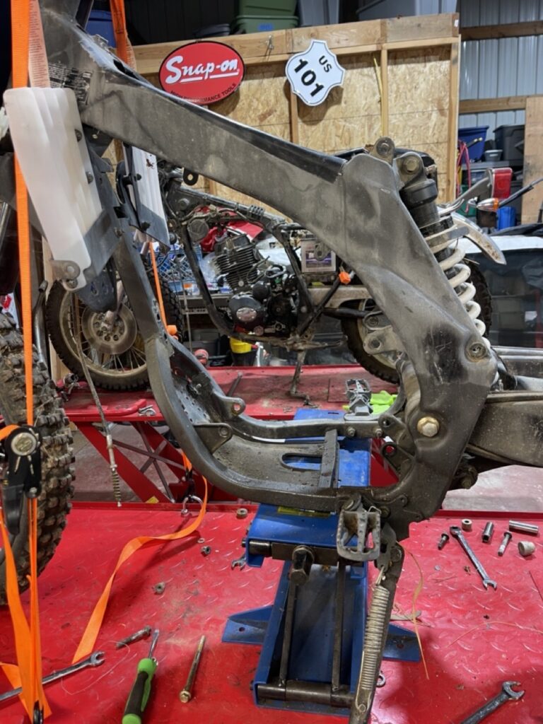 One thing led to another and before I knew it, my afternoon was spent pulling Bills lifeless engine and stuffing the donor engine in his frame. UNBELIEVABLY the donor engine was almost a drop in replacement. I was fully prepared to do lots of custom work to get this engine to fit. It seriously looked like this Chinese engine was a clone of the original from Kawasaki. It was so close that I didn’t have to do a single thing to align the sprockets. All I had to do was weld one bracket…..everything else bolted right up like it was supposed to be there.