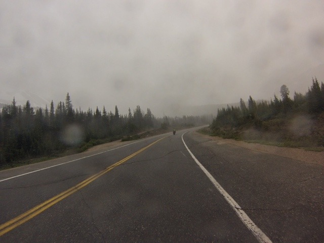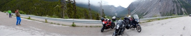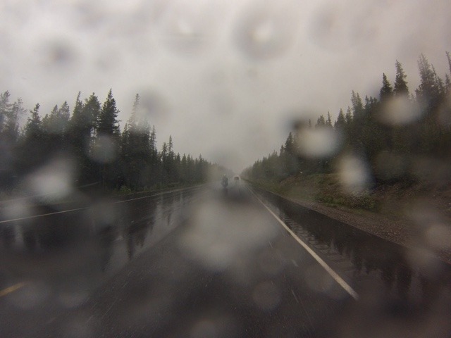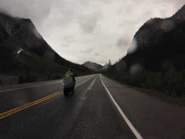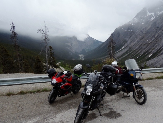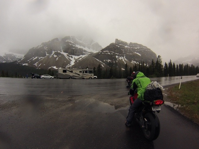 Then we hit the road and headed to Jasper. I promise I’m not exaggerating here……..3 miles……thats how far we made it down the road before the weather turned crappy. The road to Jasper is hwy 93 or The Icefields Highway and it cuts through some truly amazing scenery. It also goes right up some truly huge mountains and close to some truly frozen glaciers……..so naturally it snowed…….because Canada. Luckily the snow didn’t accumulate on the ground but it did a very good job of sticking to a helmet visor making it impossible to see. The weather made for very cold day but we still had fun. We came straight to a hotel once we made it to town and after moving in we filled our bellies with some hot food……all is right with the world now.