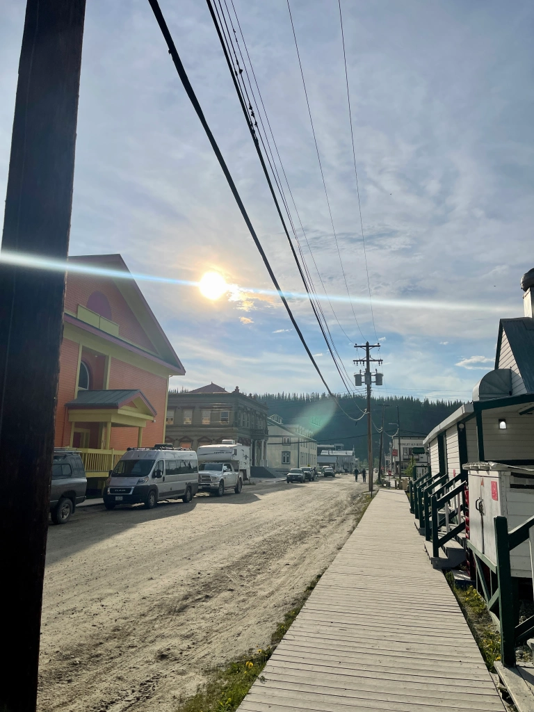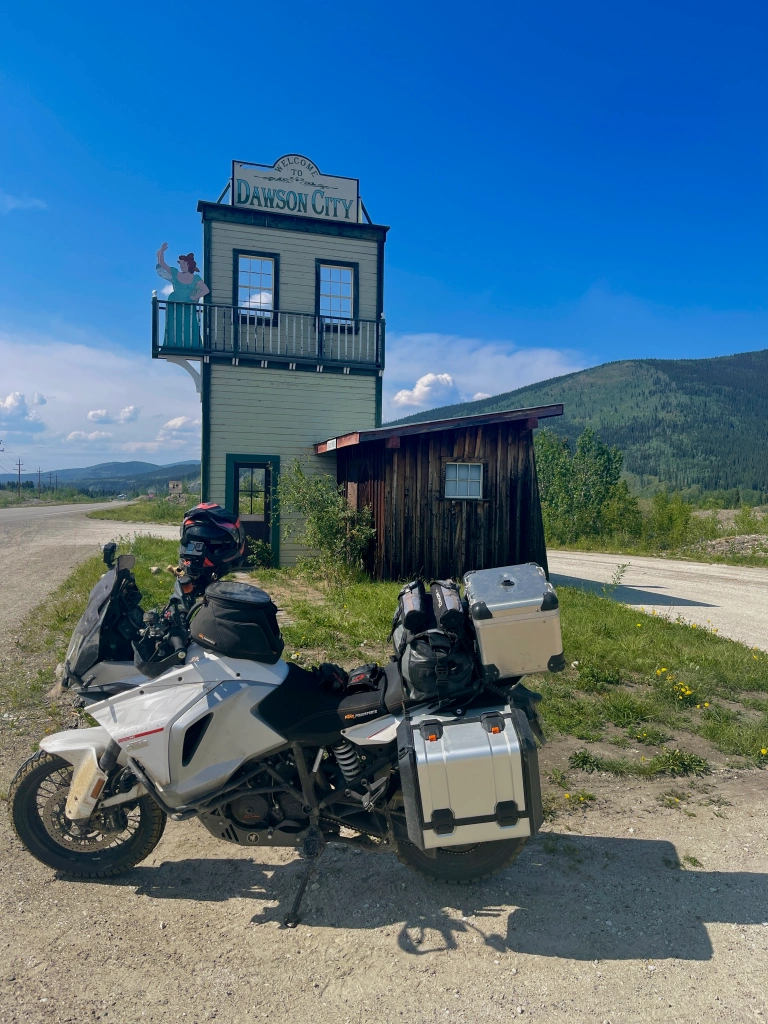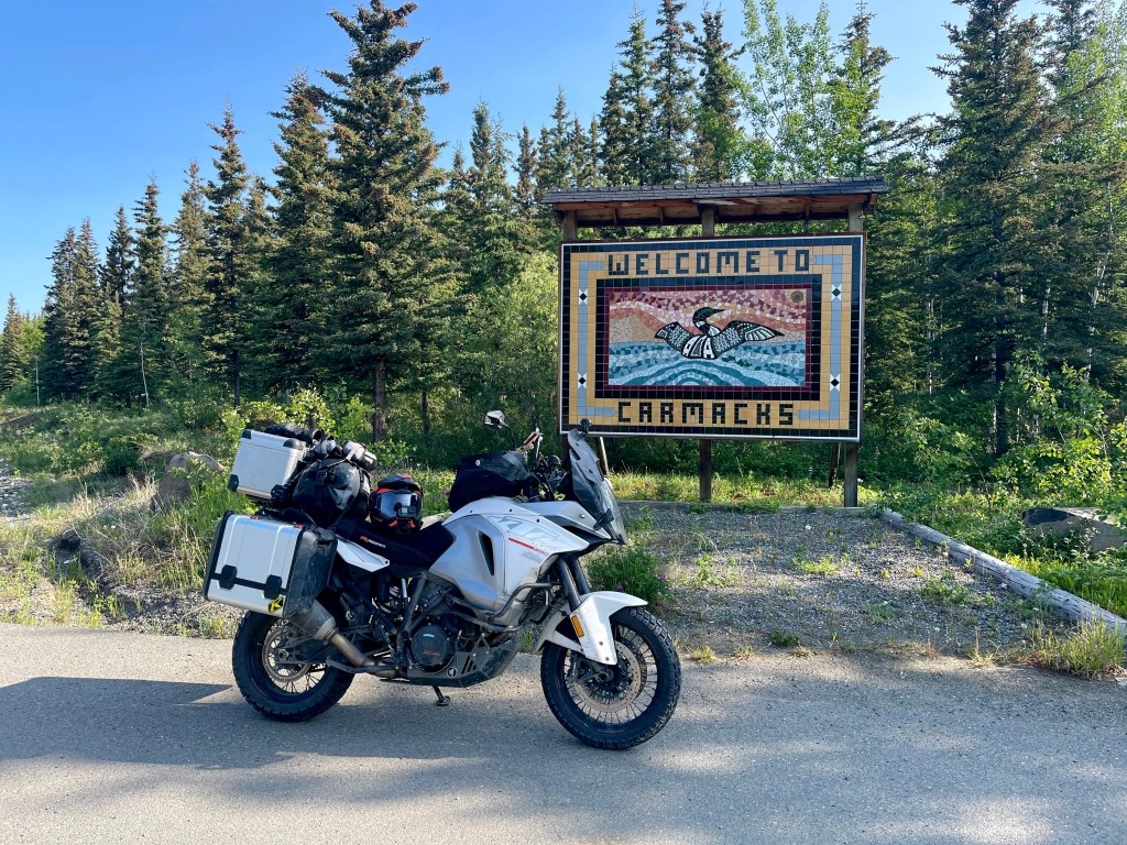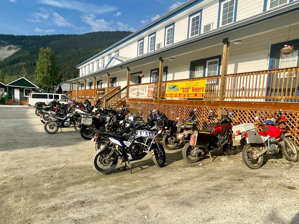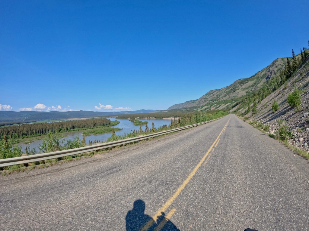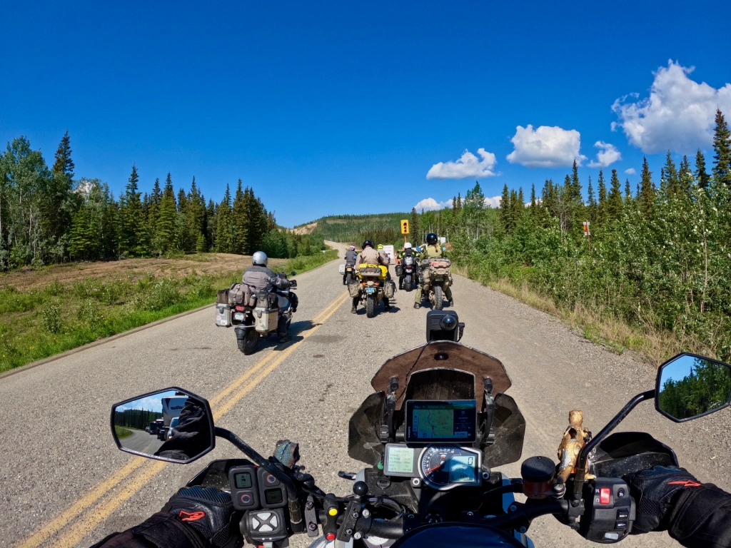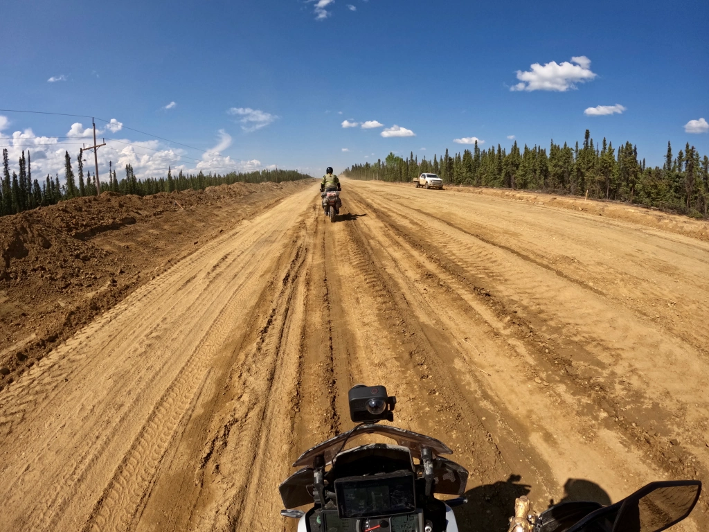Today was filled with huge wide open sky and construction. The day was spent in almost complete isolation too. I can’t believe how far Dawson City is from…anything. There was a lot of construction going on along this highway. When you come up to construction that you have to wait for a pilot car motorcycles are instructed to go to the front of the line. I think it’s to keep them from having to eat everyones dust going through the construction but I don’t know for sure. Because bikes go to the front it means we end up in big groups and it looks like a gang is coming through. At one point I was rolling with a group of 11 bikes…..out in the middle of absolute nowhere. For the most part the construction sites were pretty easy to get through. but the last one had been over watered by the water truck and it was really sloppy and rutted. One person fell over and caused a traffic jam right in the heart of the construction zone. I managed to make it through without falling but barely. Of course I didn’t get any video of it though….I was too scared to move my hands to hit record. Tomorrow is another day off for D2D.