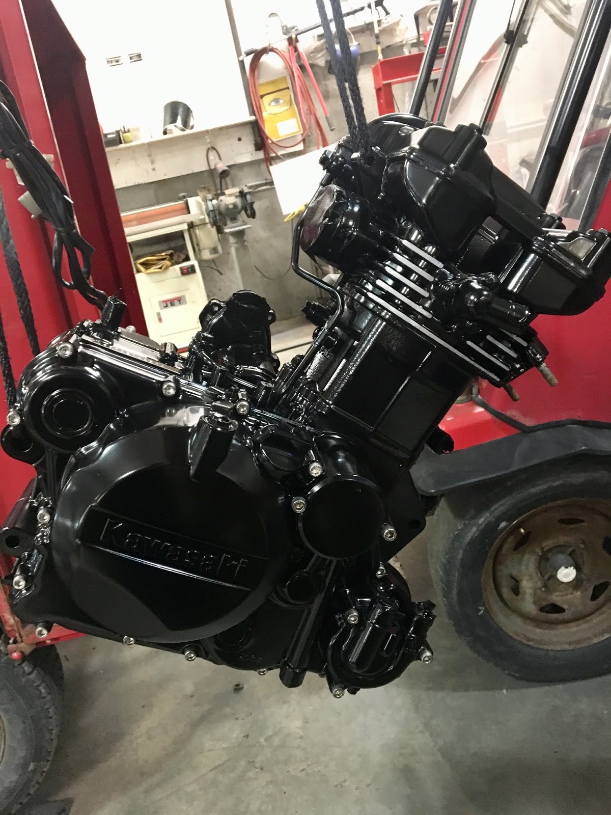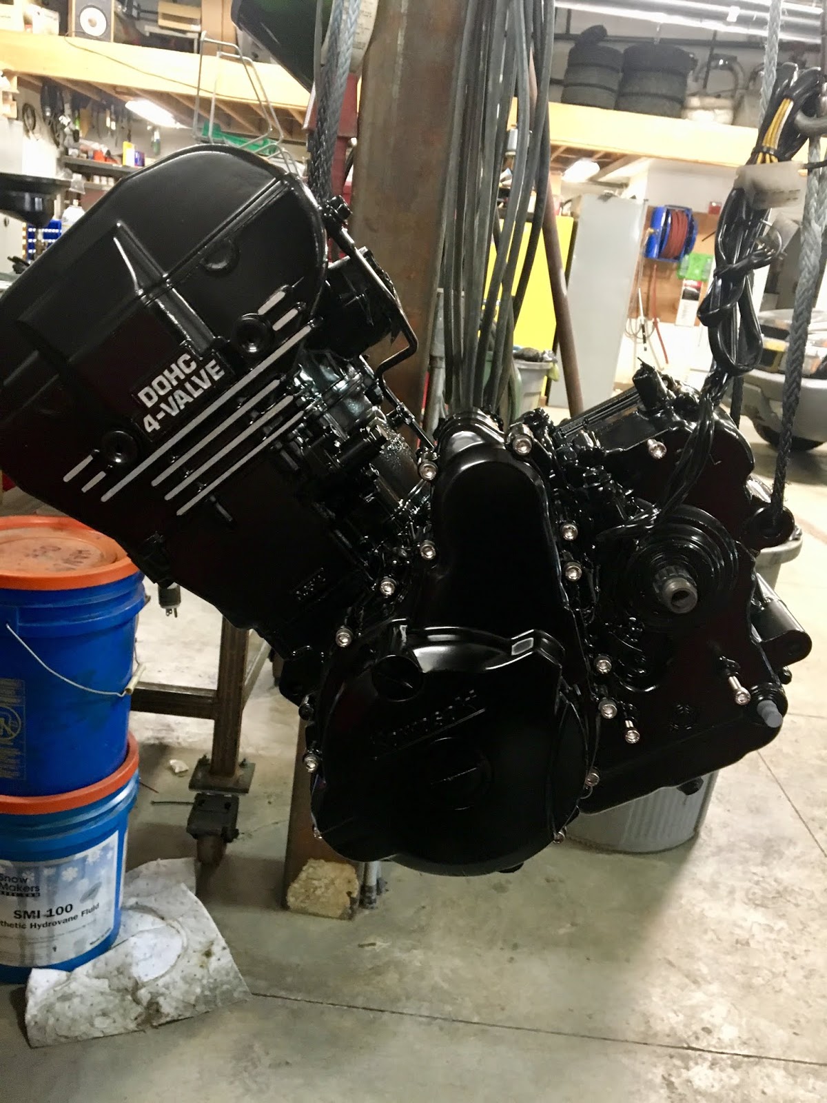 This past Friday I built up the courage to re-install the engine. I lined everything with towels and rags to prevent scratches and ever so gently stuffed the engine back in…..causing many scratches along the way. Luckily I’m smart and had touch up paint on hand so you cant see any scratches. Then I filled it with oil and coolant and put the tank back on and its officially motorcycle shaped again!