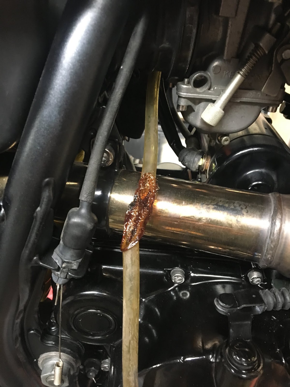 That is the vent line for the carburetor….and I routed it the wrong way during reassembly…..right next to the exhaust. I’m no expert on the voodoo that happens inside a carburetor but I am at least 68% sure that the vent line should not be melted shut. I fixed that and routed it more intelligently this time and then pulled the bowl off the carb and pulled the jets just to be sure. The main and pilot were both clean as a whistle so I put it all back together and what do you know…..it runs great.