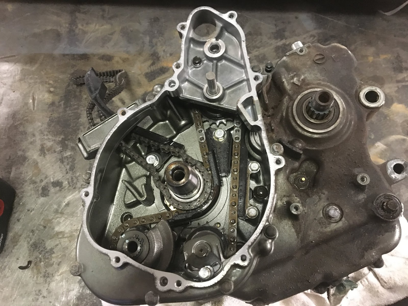 This past week I was able to spend some time on the KLR project. I got the engine split apart so I could fix the stripped drainplug. The drainplug hole has to be filled with a weld and then drilled back out and tapped to accept the drainplug again. I havent gotten the case half to a welder yet….hopefully next week.