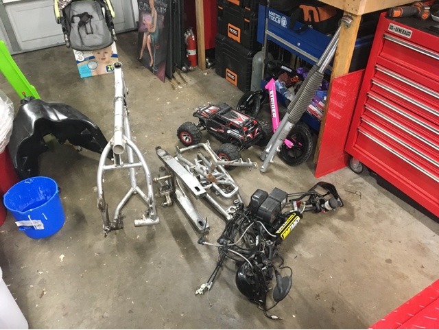 So the plan now is to get the frame powder coated in a nice semi-gloss black and then start reassembling. As it goes back together I will be rebuilding the forks and shock, redesigning the front light and instrument cluster, replacing the radiator, and installing a 692cc big bore kit. Of course this is all a huge waste of money and this bike isn’t worth the fancy handlebars let alone all the other crap….but for some reason I love this stupid thing and I’m going to keep working on it.